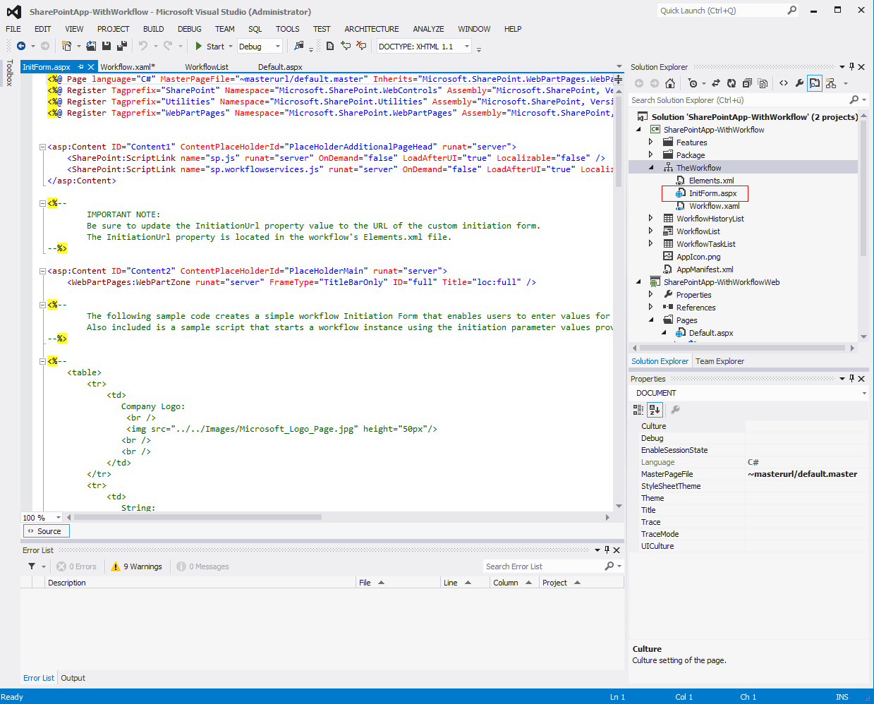 The next step is to add a custom Initiation Form by adding a new Item of Type “InitiatonForm” to the Workflow element. This adds a default InitiationForm to the project which is already populated with some code.