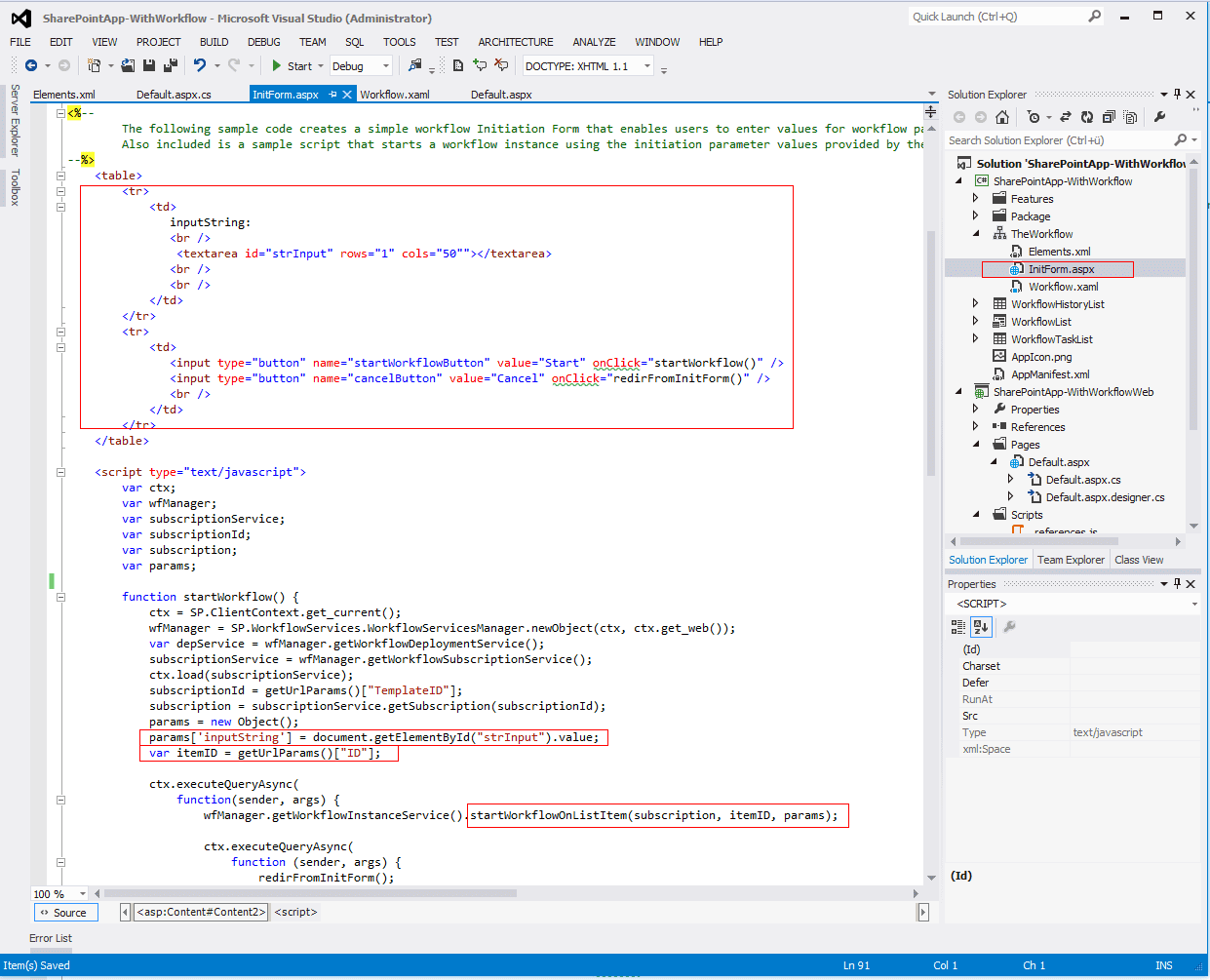 Clean up the form to only contain a single text field for our string input variable. In the “startWorkflow” function triggered by the submit button the value of the text field must be added to the params object. It is also necessary to get the List Item ID from the URL, since this is needed as parameter for the “startWorkflowOnListItem” method on the “WorkflowInstance” object.
