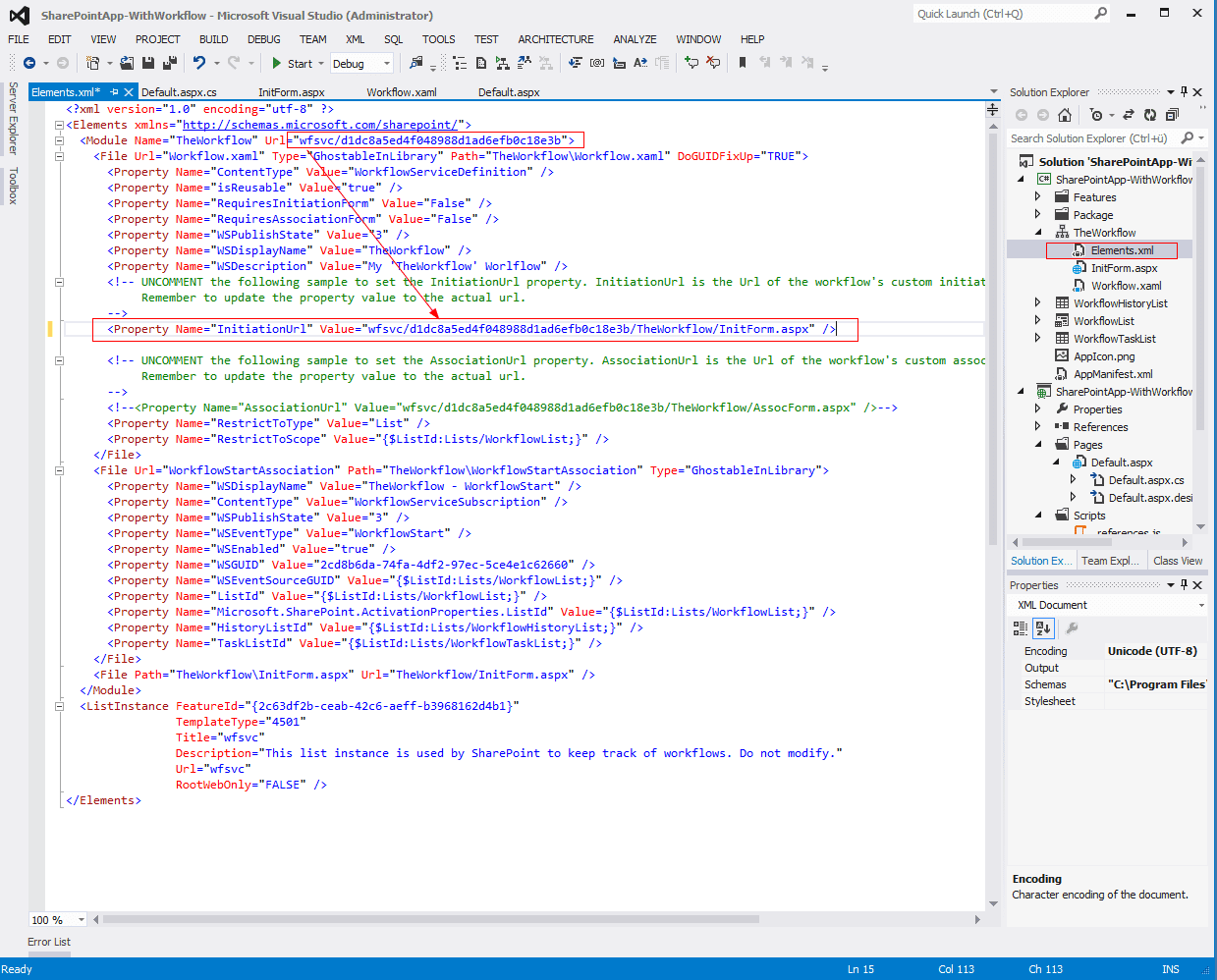 The last step is to add a reference to the custom initiation form in the Elements deklaration of the workflow element.