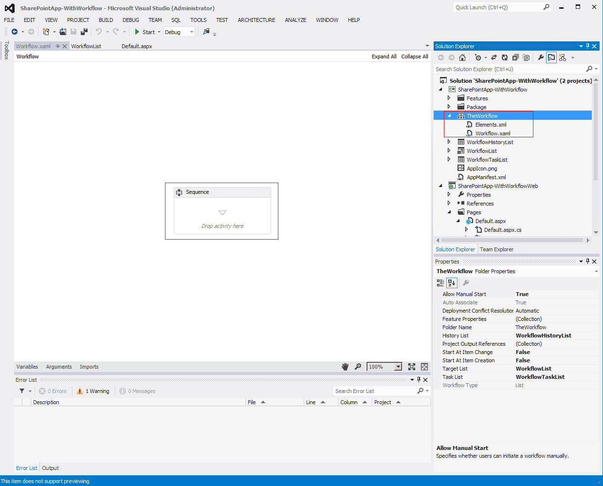 Now that we have a list, we can add a workflow to be run on that list by adding a new Item of type “Workflow”to the SharePoint AppWeb project. Set the workflow to start manually and associate it with the previously created list. Select the according items to create a Workflow History And Workflow Tasks List for the Workflow.