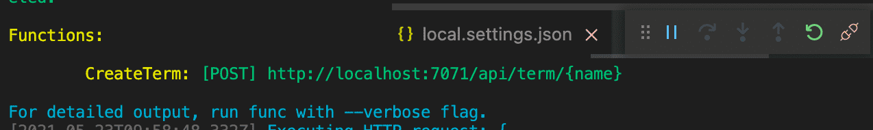}After starting the function in debug mode with F5, we see, that this does not work actually.
