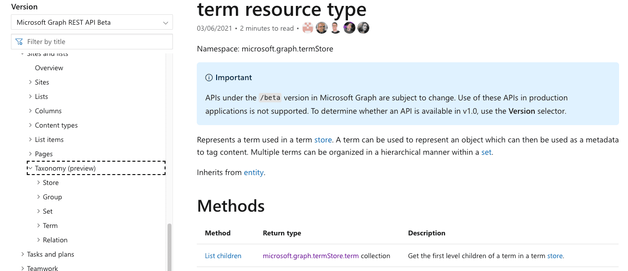 The methods for accessing the termstore leverage the new taxonomy endpoint of MS Graph beta endpoint.