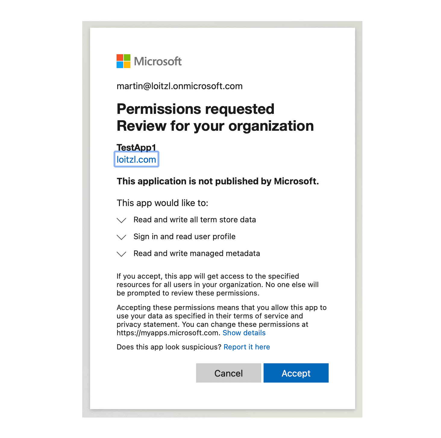 -Scopes "SPO.TermStore.ReadWrite.All", "MSGraph.TermStore.ReadWrite.All"On Windows systems the consent window will open automatically. On Linux/Mac based systems the consent Url is written to STDOUT and should be pasted into a browser window.