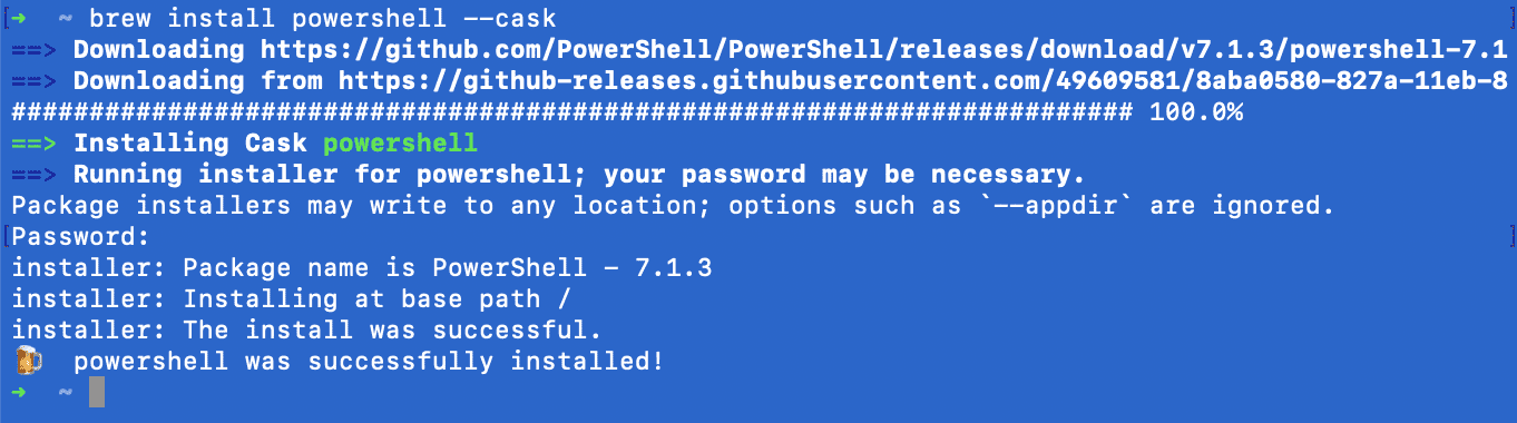 $ brew install --cask powershellThat seemed to work, no lets start PowerShell.